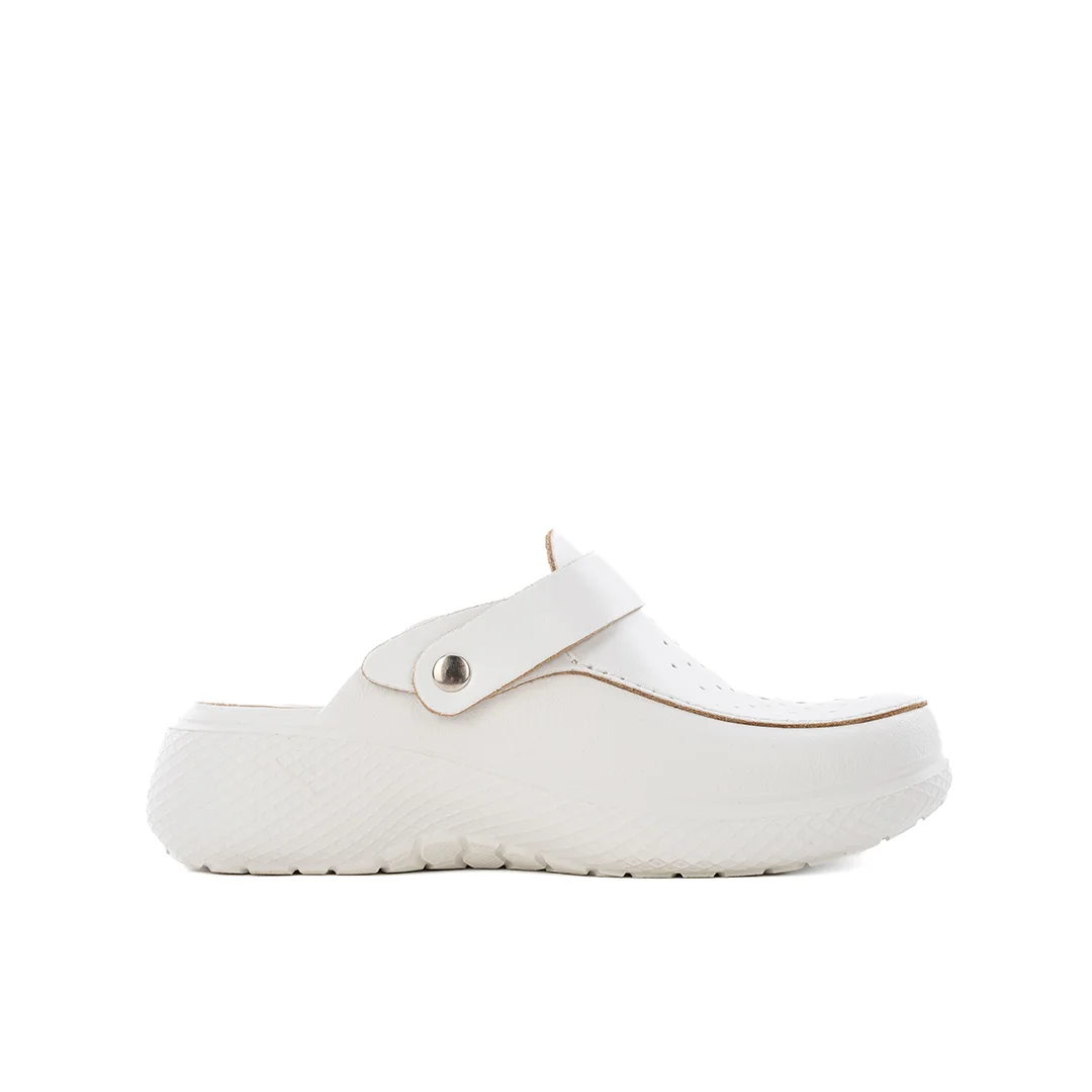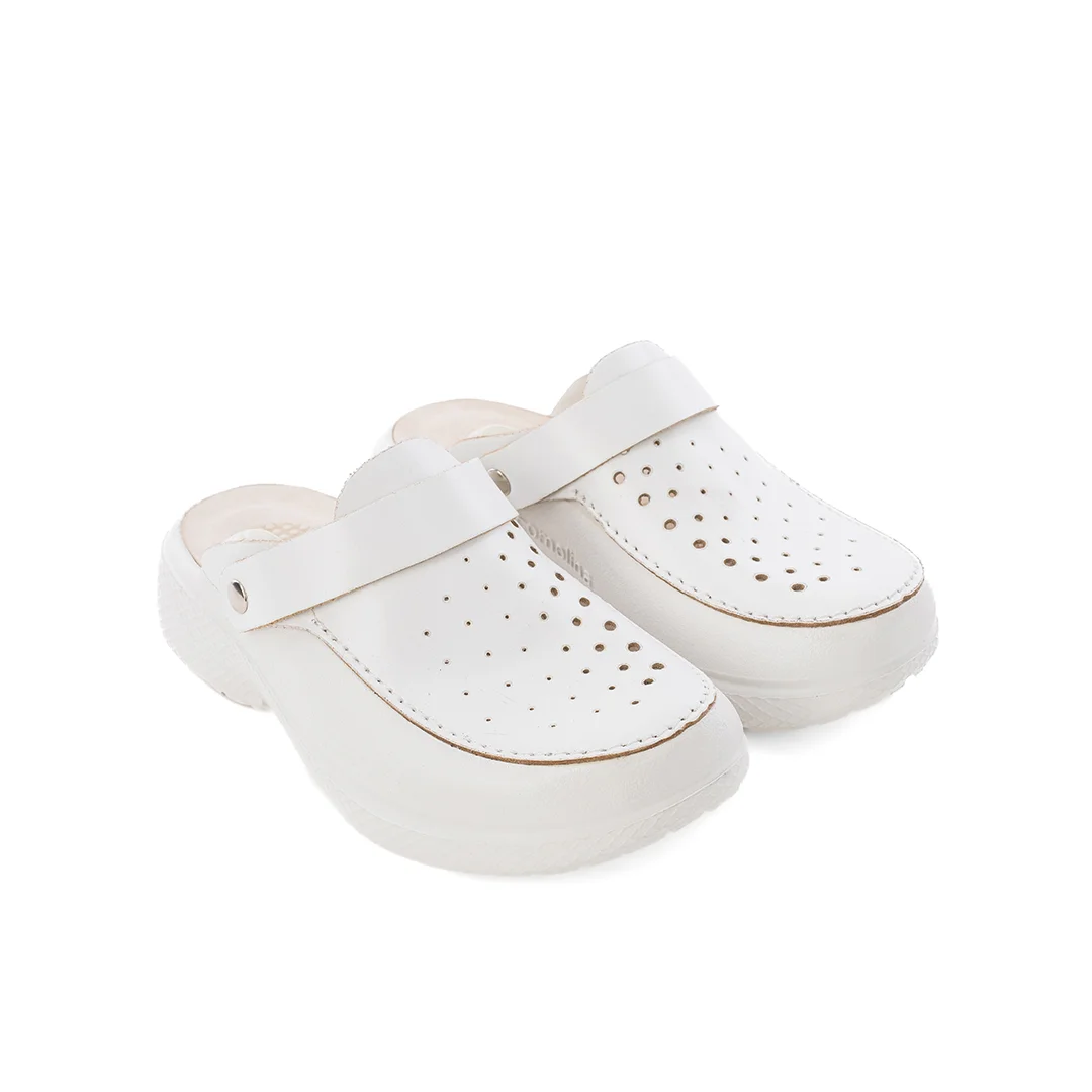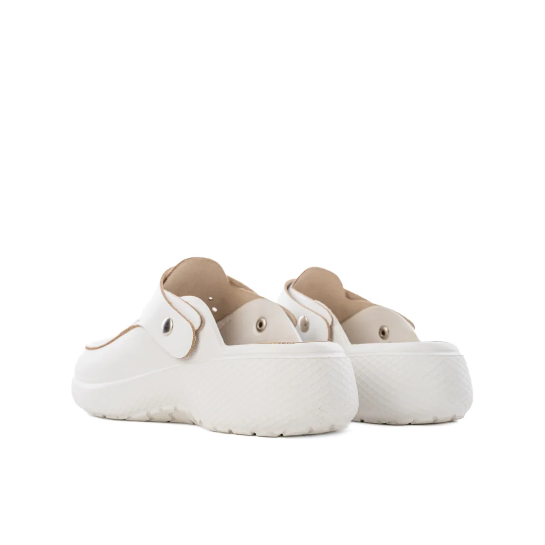 The Biancomolina “EVA Light” clogs are made from natural materials, featuring an upper and lining of soft cowhide leather. The sole is made of EVA foam, and the product is available in sizes 36 to 42. They come in a variety of colors, including white, beige, mint, orange, pink with a beige face, pink with an orange face, gray, and yellow.
