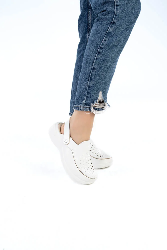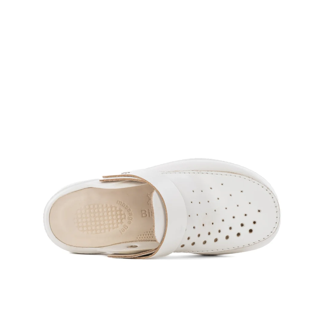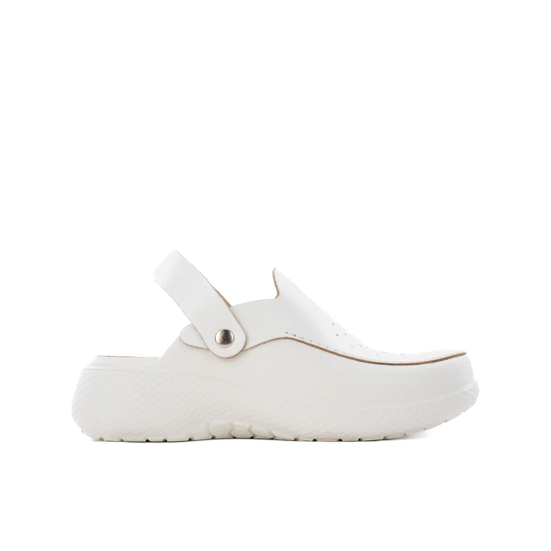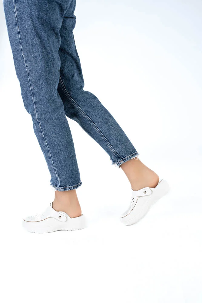 The Biancomolina “EVA Light” clogs are made from natural materials, featuring an upper and lining of soft cowhide leather. The sole is made of EVA foam, and the product is available in sizes 36 to 42. They come in a variety of colors, including white, beige, mint, orange, pink with a beige face, pink with an orange face, gray, and yellow.